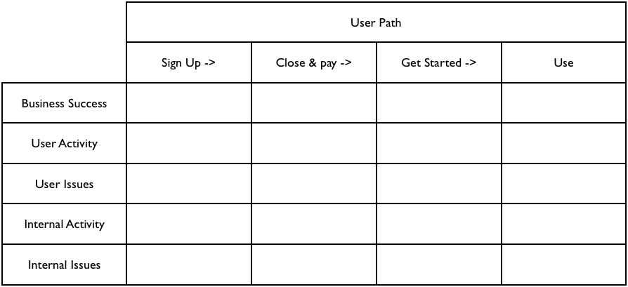 Not terribly sexy, quite useful. It’s some sort of amalgamation of a customer journey map (Adam Richardson’s HBR article is still a good intro) and various matrix models I’ve lifted from former colleagues with questionable pasts at McKinsey, BCG and the like. It’s worked well for the sort of hybrid UX design and business operations projects I’ve been working on lately. It applies well with startups where product and internal process is still completely intertwined and organizational breakdown matches the customer journey. Where the organization is molded around the product and by extension, the user experience.